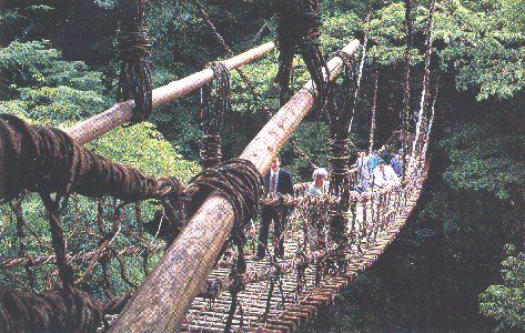ここから吉野川は川幅を狭くしながら、違った顔を見せ始める。大歩危・小歩危の景勝を横切り、山へ入ってゆくと「祖谷のかずら橋」がある。かずらを編んで作った吊り橋で、ゆらゆらと揺れながら渡り切るには、少し勇気が要りそうである。朝露にかすむ橋は、絶好の被写体でもある。