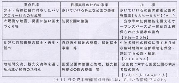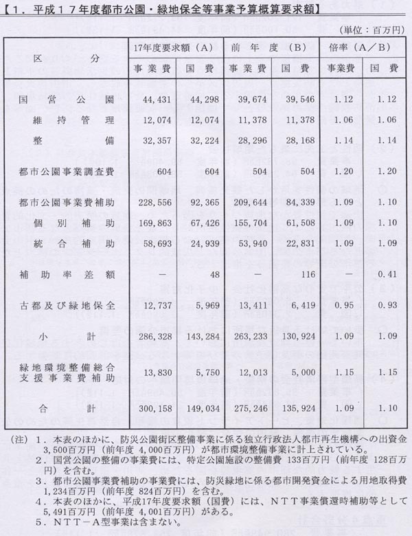 概算要求の基本方針には、@緑とオープンスペースの総合的・計画的確保 A 社会資本整備重点計画の実現――が掲げられ、都市域における水と緑の公的空間確保量を平成19年度までに約1割増(平成14年12u/人→平成19年13u/人)とする指標などを示した。