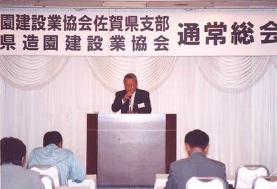 県業界の実態も、平成7〜8年頃のピーク時に比べて受注量は半減しており明るい展望が開けず苦慮している。ところで、先般、我が国で初めての景観と緑に関する法律いわゆる「景観緑三法」が成立したことは、景観と緑環境の共生をめざす我々造園業界にとって喜ばしいことだ。私共は、これを契機としてこれまで蓄積してきた技術・技能や知識を発揮できる場が与えられたことになる。また、一方、県においても昨年、新しいリーダーとして古川知事を迎えて「変革と創造の佐賀づくり」を掲げられ「立県改進」の精神のもと「癒しに満ちた環境の先進県」の実現に向けた決意が強くうかがえる。