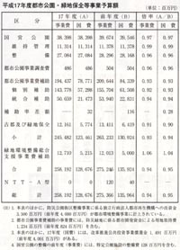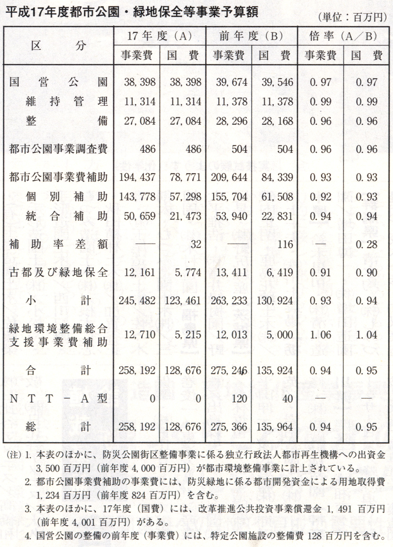 平成17年度予算を前年度と比べると、国費0・95倍、事業費0・94倍で、古都及び緑地保全が事業費ベース0・91倍で減少の割合が最も大きく、一方で緑地環境整備総合支援事業費補助が1・06倍と前年度を上回る予算となった。