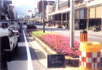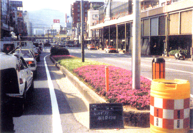 植物による手法は、地面(裸地)を被う「地被類(グランドカバー)」の利用であり、サツキ類のように下木、下草類の群植もあり、具体的に地被類に丈が何p以下との決まりもないため、ここでは @丈の低いもの A地面に密着して成長する B刈り込みに耐える C繁殖力が強い D常緑(木本)か多年草(草本)であるものとした。 シバザクラのフィールド試験は、3月に植栽し、5、7、9、10月の年4回の除草を行い、灌水は適度な降雨があったため必要としなかった。成長は良好で、雑草は少量しか見られなかった。(写真3施工前、4施工直後、5施工後2年経過、6施工後2年経過) ハイビャクシンのフィールド試験は、植栽前に抜根除草、土壌改良後の3月に植栽、6月に抜根除草を行った。適度な降雨の後の晴天で雑草が繁茂し、ハイビャクシンを覆い、日照不足と自動車の排気ガス、暑さにより、枯死が目立ち、50%から60%の枯死率となっている。(写真1施工後、2施工後5カ月経過50%程度雑草により枯死) 枯死の原因は除草時期の遅れと植栽箇所、樹種の選定の関係が考えられる。 今後の課題として、植栽箇所において、以前は年間3回の抜根除草が行われていたが、経費縮減のため2回となっており、根茎繁殖雑草が増加していたと思われる。このため、植栽を被覆させるために最初の1、2年は年4、5回の抜根除草が必要。経費は掛かるが効果は顕著である。 このため、植物(グランドカバー)による手法においては、植栽場所、種類、u当たりの植栽本数、植栽後の管理計画の検討が必要で、除草回数の軽減に、防草シートを併用した方法がもっとも効果的といえる。