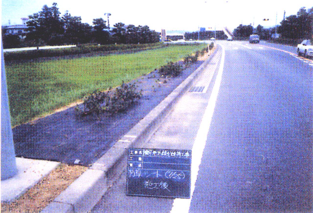 防草シートは植生的な雑草抑止として、シート下の雑草抑止、種子の飛来による雑草抑止を果たす。前者は、シートによる遮光で、盛夏の10万ルクスを99・6%以上遮光し、光合成に必要とされる400ルクス以上にならないよう遮光し、光合成を阻止、雑草の成長を抑止する。 後者は飛来した種子に水分を与えないことで発芽を防ぐ。このため、シートは透水性で、表面上に水分を保たない構造とすることで、種子はシート上で枯死する。防草シートにはこの2つの機能が求められ、さらに踏圧などの耐久性と、地面との馴染み、経済性が要求される。 利用に当たっては、@雑草の繁茂を相当期間にわたり抑制できる A地表面をシートが覆うため、植栽本数が少なくて済む B初期投資が必要だが除草など、以降の経費節減が見込める C中央分離帯等の裸地部分での利用に効果が認められる D交通の頻繁な道路や商店街や都心等、作業の安全や周囲への影響があり、維持管理が無視できない地域で施工価値が高い E乾燥防止効果があるため、植物の生育が良好 F全面施工地では雑草の発生はほとんど見られない――といった利点を持つ。(写真7防草シート施工直後、8施工後8週経過) 一方、@コストが掛かるAチガヤ、ススキ、ササ等の地下茎が残っている場合に発生 B縁石部分などで発芽防止の工夫が必要 C宿根系の匍匐枝による繁茂植物と低木以外の球根、一年草、地下茎等の繁茂形態植物は、次世代の更新ができず永年使用ができない Dタバコの投げ捨て等により、溶融し、穴が開いて雑草が発生する――点には注意が必要である。 こうした長所と短所については、改良も加えられ、ポット苗を植栽する植え穴や縁石との隙間からの雑草発生について、遮光シーリングなどで解決のめども立っている。 こうしたことから、植物とシートの併用においては、施工前に除草剤を散布して被覆すると好効果が得られ、初期コストは掛かるが、年間ベースで経費の節減につながり、軽作業員の確保を考えた場合にも作業軽減は効果があるといえる。