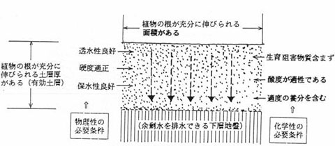 (社)日本造園建設業協会は、平成2年度から4年間にわたり建設省(現国土交通省)の土木研究所と″植栽基盤の造成技術に関する共同研究″を行った。この時はじめて植栽基盤とは「植物が正常に生育できるような状態になっている地盤」だけを示す用語であると定義し、「植物の根が支障なく伸長して、水分や養分を吸収することのできる条件を備えており、ある程度以上の広がりがあり、植物を植栽するという目的に供せられる土層を植栽基盤という。なお、排水層がある時はこれを含む。」と定義された。 |