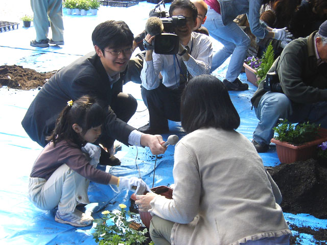 当日、天神中央公園ではマスコミの取材も行われ、花と緑”美しい町並み“をという題目で、 夕方のNHKニュースで映し出されました。ニュースでは「花と緑で美しい日本を!」と書かれたお揃いのジャンパーを着た20数名の県支部会員が、色とりどりのパンジーやビオラを多くの市民にプレゼントしている公園での奮闘ぶりが映し出され、また会場での和やかな雰囲気や木下九州総支部長のインタビューのなかで「家庭でも花を飾ってもらい美しい町並みをつくってほしい」という言葉が紹介されました。