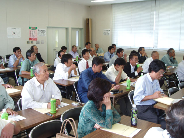 | 水戸市の造園会館には50人が集まり熱心に聞き入った |