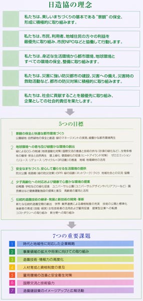 これからの造園像示す日造協の「VISION21」 五十嵐 今回のテーマとする「VISION21」は、平成9年に発表した「日造協のビジョン」を刷新したものである。 旧ビジョンは、平成7年に当時の建設省が「建設産業政策大綱」を発表、”新しい競争の時代“をキーワードとしていたことから、これに応える形で、造園建設業のあるべき姿を示したものであった。 バブル経済末期の当時は、心の豊かさや地球環境問題が問われ始めた頃であり、造園技術を”多様な生き物と共生し自然に対する慈しみの文化の技術“と定義し、他の技術との差別化、向上について提示。 さらに、造園建設産業は、”感性を持った生きもの技術“を基盤とした他に例のない産業とし、造園建設産業への理解を目指した。 しかし、それから9年が経過し、社会情勢は大きく変化した。多くの識者の方々が21世紀は環境の時代、緑の世紀と語る中、景観緑三法などの新たな制度が創設された。 平成18年に発表した「VISION21」は、こうした時代へ対応すべく策定された。 「VISION21」では、造園建設業を、オープンスペースをマネージメントし、計画・設計、施工、管理する”緑のスペシャリスト・緑地管理のゼネラリスト“とし、「人と自然が共生する『緑の景観・環境』創造事業」をめざすための五つの目標、七つの重要課題をまとめ、新しい造園建設業の向かうべき方向を明らかにしている。 ”旧ビジョン“はどちらかというと、建設産業政策大綱に対する業環境について頁を割いたものといえるが、「VISION21」は、新しい世紀が”環境の世紀“、 ”緑の世紀“となるだろうといった造園業界にとってフォローとなる風を背景としていたため、「これからの時代に求められる造園」といった課題に力を入れた点が大きな特徴といえる。 新たな年を迎え、新たなビジョンをもとに、事業を進めていくが、環境の時代という追い風の中にありながら、具体の事業というと、公共事業の縮減をはじめ、なかなか厳しいものがある。 そこで、この座談会では、「VISION21」の具現化、造園建設業の活性化に向けてのヒントが提示できればと考えている。忌憚のないご意見を頂きたい。 そこでまず、都市公園をはじめ我われが基盤としているとする事業を担っている小川課長に、ビジョンへのコメントを含めてお話を伺いたい。 三つの多様性踏まえた行政に 国土交通省の取り組み 主体については、行政はもちろん、NPO、市民、企業、さまざなま主体の参加が必要であり、制度では都市緑地法や都市公園法の二つの根幹となる法制度、さまざまな事業手法を駆使して推進していく。機能や意義は実にさまざまであり、そこに棲む生きものの多様性、地域の歴史や文化などの面での多様性もある。 こうしたことを踏まえて、「VISION21」を拝見すると、協会の理念に、NPO、市民の方々との協働、企業としての社会的責任を果たすことを掲げていることがまずもって共感できる。 緑とオープンスペースにかかわる政策課題という点では、四つの柱を掲げている。一つ目は「都市再生への対応」で、ゆとりと潤いに欠ける市街地、災害に脆弱な都市構造の改善という観点から都市の再生。 二つ目は「地球環境問題等への対応」で、地球温暖化の防止、ヒートアイランド現象の緩和、さらには生物多様性の保全など、環境の観点からの対策の推進。 三つ目は「豊かな地域づくり、子育て環境の向上への対応」で、観光振興、地域の活性化、子育て環境をどうやって確保していくか、地域の資源の活用など。 最後は「参画社会、バリアフリー社会への対応」で、緑とオープンスペースの保全・創出、管理の段階での地域住民やNPO等の参画による協働のための場づくりや、高齢者、障害者等に配慮した都市公園のバリアフリー化の推進――を行っていくこととしている。 「VISION21」では、これについても、五つの目標が専門技術者の的確な視点から示され、都市再生における安全性と快適性、地球環境の保全など、四つの政策課題にも対応している。 さらに、都市公園には多様な技術が必要であるが、その中核を成すのは造園技術であり、「VISION21」の目標では、伝統技術だけでなく、新技術の開発や革新にも触れられており、大いに期待される。 さらに、「VISION21」には、これらの具体的な展開として、新しい施策への対応や緑化による資産価値の向上、環境系技術の活用などが記されている。 ビルの屋上から、里地、里山、そして臨海地域まで、多様な環境技術が求められる現状への対応も、ビジョンに示された通り重要である。 そのほか、国際交流などは、タイのチェンマイで国際園芸博覧会が開催中で、日本国政府出展の日本庭園が好評を博している。日造協においては、日本の代表団体として国際園芸家協会に加盟されるなど、これまでの実績を踏まえ、今後の更なる活躍も期待される。 予算や今後の動向について少々お話しすると、平成18年は都市公園法施行50周年に当たる。第1次都市公園