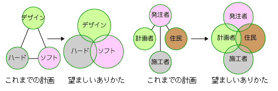 | (3) 計画・設計: | これまでの進め方と異なり、発注者、計画者、市民住民、施工者が、共通の場で論議して、計画、設計内容を決定していくシステムを創り、運営していく必要がある。 |