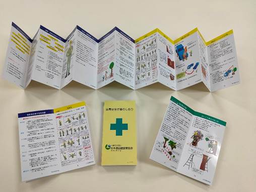 ・週間・月間の安全サイクル ・服装と整理整頓 ・安全は“整理整頓”から ・第三者災害防止 ・事故発生時の応急処置 ・合図法 ・掘削作業 ・車輛災害の防止 ・重機による作業 ・移動式クレーンによる作業 ・高木剪定作業 ・はしごと脚立の使い方 ・高所作業車による作業 ・作業に必要な資格等の確認 ・墜落制止用器具(安全帯)等の安全点検 |