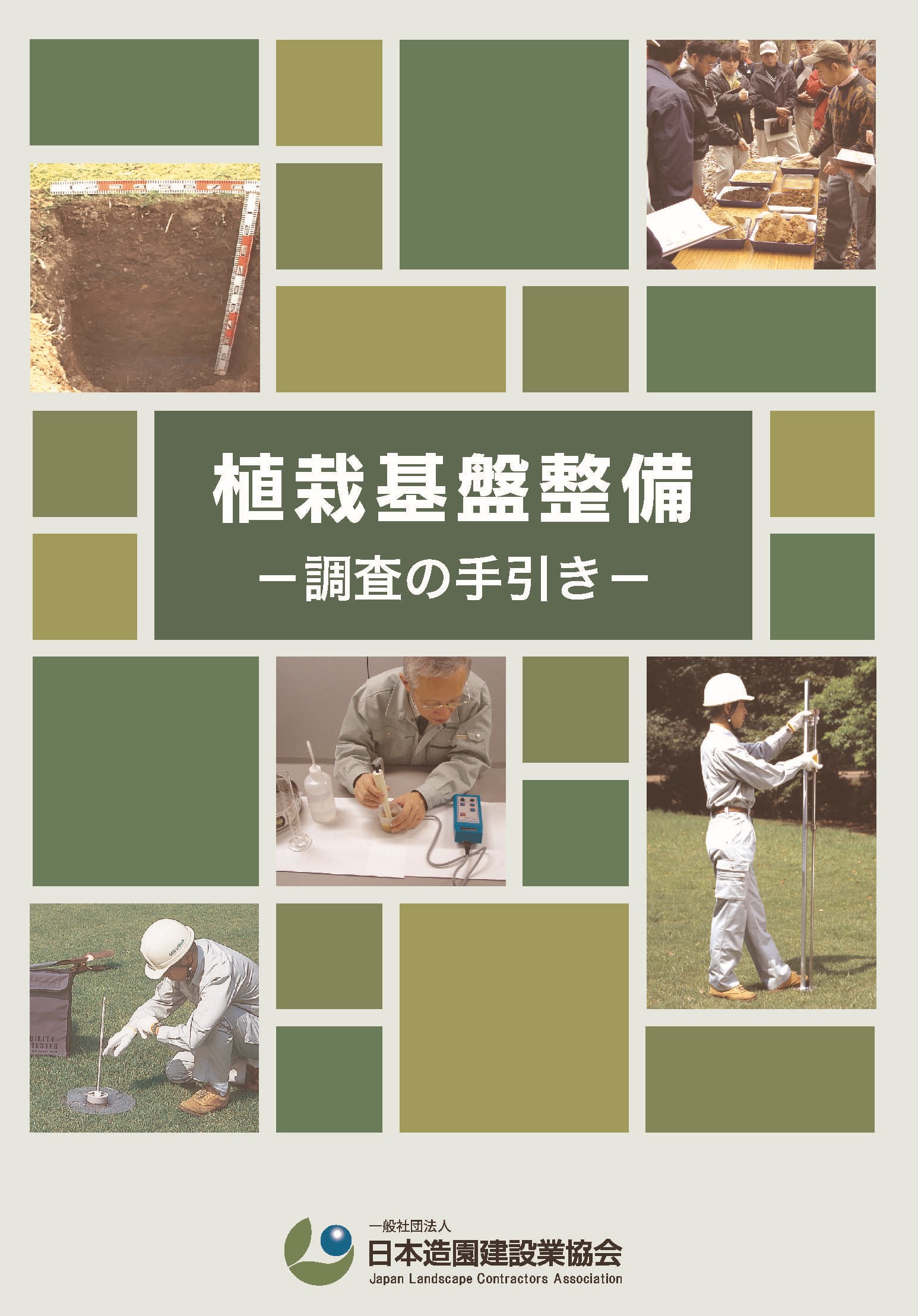 2.土性(指頭) 3.土色(土色帖) 3.土壌硬度(長谷川式土壌貫入計・山中式土壌硬度計) 4.透水性(長谷川式簡易現場透水試験器・植穴透水試験) 5.水素イオン濃度指数(pH) (pH メーター) 6.水溶性塩類<電気伝導度(EC)>(EC メーター) (資料) ・土壌断面調査票(記入例) ・土壌断面調査票 ・検土杖調査票(記入例) ・検土杖調査票 ・長谷川式土壌貫入試験調査票(記入例) ・長谷川式土壌貫入試験調査票 ・長谷川式簡易現場透水試験調査票(記入例) ・長谷川式簡易現場透水試験調査票 ・「植栽基盤調査報告書」作成の手引き ・整備工法の選定例(対象:高木植栽工) |