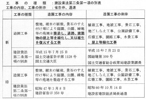 造園工事の内容と具体的な例示については建設業法の第二条の別表により定められているが、近年の造園緑化に関する工事の領域と対象工種の拡大により、公園緑地等だけでなく、道路、建築物の屋上等の緑化、植生の復元までを含めた広範囲な領域を対象としている工事であるという理解が十分得られていない面があった。