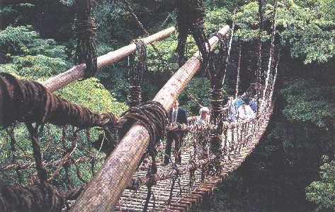 ここから吉野川は川幅を狭くしながら、違った顔を見せ始める。大歩危・小歩危の景勝を横切り、山へ入ってゆくと「祖谷のかずら橋」がある。かずらを編んで作った吊り橋で、ゆらゆらと揺れながら渡り切るには、少し勇気が要りそうである。朝露にかすむ橋は、絶好の被写体でもある。