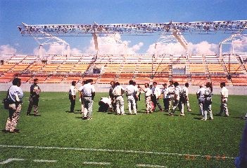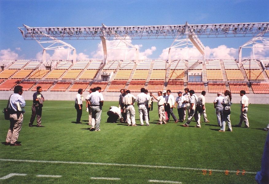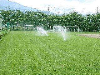 県営サッカー場は、Jリーグの試合も出来る本格的なグランドで、年間使用回数も制約があり、造園専門業者による維持管理が徹底して行なわれているだけあって実に見事な芝生に仕上げられていた。このグランドの特徴は散水のための設備が地中に埋設されており、散水時にポップアップ式スプリンクラーのヘッドが持ち上がりコンピュータ制御により芝生に均等に散水が可能なことである。