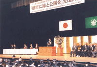 「都市に緑と公園を」全国大会は都市公園制度制定130周年、日比谷公園開園100年記念に合わせ10月24日、東京・千代田区の日比谷公会堂で開催。表彰式(受賞者別掲)やシンポジウムなどを行った。 大会は冒頭、主催者を代表して、田邊昇學 6日本公園緑地協会会長があいさつ。次いで、来賓として、石原国土交通大臣の祝辞を竹歳誠国土交通省都市・地域整備局長が代読。「公園緑地に限らず、道路、河川、公共施設の緑化を進め、ヒートアイランド対策を図ることとなった。幅広い都市緑化運動を展開し、国民的運動につなげていきたい」と述べた。 続く報告では、「水と緑がきらめく未来都市 郡山」の実現に向けて、藤森英二郡山市長がその取り組みを紹介。国土交通省都市・地域整備局公園緑地課・高梨雅明課長が「公園緑地行政をめぐる最近の動き」について報告。午後からは、日比谷公園開園100年記念シンポジウムが開かれた。 |
