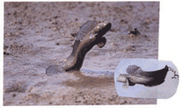 まずはじめに紹介したいのが「ムツゴロウ」この魚は、ひところ県魚に指定しようと云った地元の運動が盛り上ったこともあったくらいで、「ムツゴロウを見ずして、有明海を語るなかれ」といってよいほどの生物、一度ぜひ、生態をみていただきたい。普通は、活きたまま串に刺し、炭火で両面を焼く、うなぎのタレに似た味のタレをつけて焼く、ムツゴロウは一見目つきなどから気持の悪い魚に見える人もいるようだが、かば焼きにすると非常においしく、うなぎのような脂っこさがないところが格別で滋味といったところである。