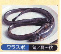 つぎに、「ワラスボ」この魚は、きばのあるどうもうな魚で、うなぎのような形をしているハゼ科の仲間。一年中とれているが、一番おいしい季節は、産卵前の七月。煮つけて食べたり、干物にしたものをあぶったり、から揚げにして食べるとひなびた味わいがよろしい。(日本酒・ビールの肴にもってこい)