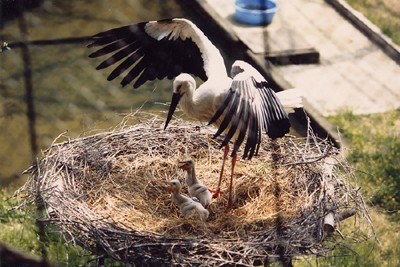 ヨーロッパでは「赤ちゃんを運んでくる」と言われ、日本では「めでたい」象徴として扱われるコウノトリ。洋の東西を問わず古くから人々に愛され、人々の生活と共に暮らしてきた。白い体と黒い風切り羽のコントラストが美しく、翼を広げると2mにも達する。その風貌からツルと混同されてきたが、食性は肉食であることや樹上に営巣することなど生態が異なり、分類上はサギやトキの仲間に属する。襖絵や花札などで描かれる「松上の鶴」は、実はコウノトリのことだ。ツルは木の枝に止まれない。