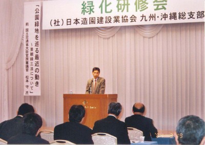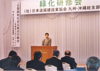 景観や緑の質を高める総合的な施策である「景観緑三法」の成立が待たれるなか、事業委員会主催の平成15年度緑化研修会が、3月18日(木)福岡市で開催され、九州・沖縄の各県行政機関、関係団体、会員等から90名が参加した。 先ず、環境省九州地区自然保護事務所長の新井正久氏が「九州における自然環境保護の現状と課題」と題して、九州地区における環境省自然保護の取組み、阿蘇の草原の現状と再生に向けた取組み、これからの自然再生のあり方等について講演された。 次に、前 国土交通省大臣官房審議官松本守氏が「公園緑地を巡る最近の動き ~景観緑三法」と題して講演された。 昭和47年に始まった都市公園整備の5カ年計画も6回を重ねる中で、当初の1人当たりの公園面積2・8haが、30年を経過して10haまでに整備が進んだ。地球温暖化対策、市民の公園や緑化に対するニーズの変化、公園財政に対応した法整備の必要性が求められているなかで、景観法の施行、関連法案の整備、都市緑地保全法の一部改正等、いわゆる「景観緑三法」の制定に至った経緯、今後の公園のあり方等も含め、豊富な経験等も交えて示唆に富んだ講演に、参加者も熱心にメモを取っていた。 |