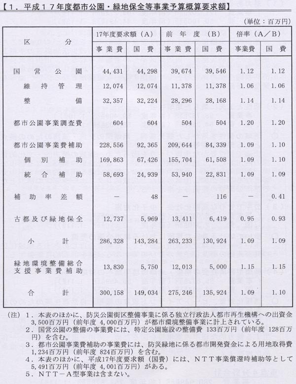 国土交通省は8月末、平成17年度都市公園・緑地保全等事業予算概算要求概要を発表。要求総額は事業費ベースで、前年度比1・09倍の3001億5800万円で、このうち国費は1490億3400万円で、前年度比1・10倍となった。