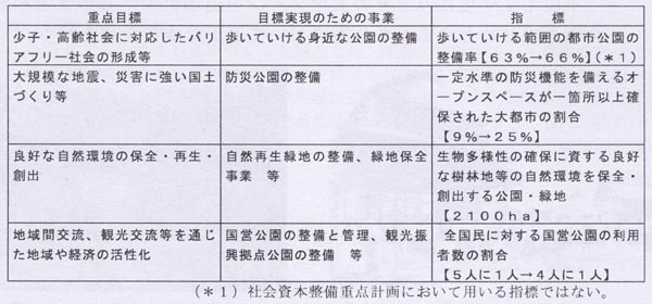 概算要求の基本方針には、①緑とオープンスペースの総合的・計画的確保 ② 社会資本整備重点計画の実現――が掲げられ、都市域における水と緑の公的空間確保量を平成19年度までに約1割増(平成14年12㎡/人→平成19年13㎡/人)とする指標などを示した。