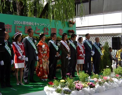 北側一雄国土交通大臣をはじめ、浅倉義信東京都建設局次長、竹歳誠国土交通省都市・地域整備局長、伴襄都市再生機構理事長、田邊昇學都市緑化推進協力会会長、高原慶一朗都市緑化基金会長など、都市緑化推進団体の代表らがステージに登壇、あいさつ。