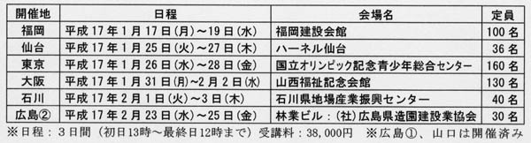 全国建設研修センターの講習は全国31カ所で実施、各地で複数会場、複数回開かれており、11月から来年3月までのスケジュールも発表済み(www.jctc.jp、03・3581・0847)。東京では2会場10講習が予定されている。