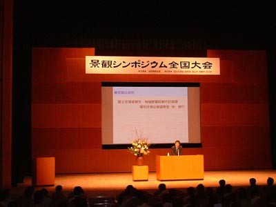 初日の15日は、13時より、野本孝三会長はじめ主催者の開会あいさつのあと「景観法制定後のまちづくりのあり方」として、西村幸夫東京大学教授の基調講演、引き続き国土交通省による景観法説明が行われた。