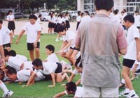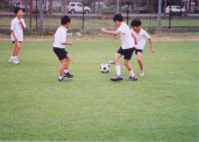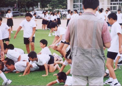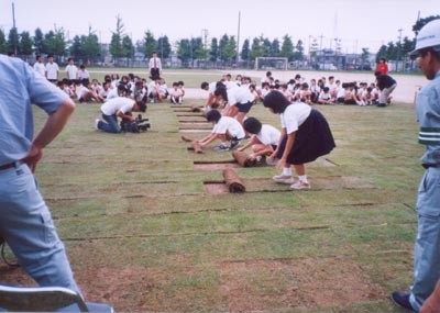 式の終了後は、児童たちが雨上がりの緑鮮やかなグランドへ飛び出し、市で購入した芝刈り機の操作を習ったり、芝生に転がったり、腕相撲やピラミッドの組体操をしてみたりするなど、思い思いに芝生の感触を楽しみ、大はしゃぎとなった。