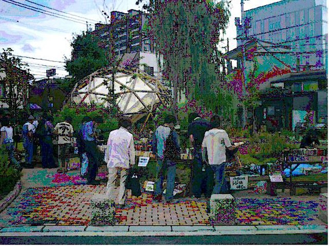 鳥取市内の中心市街地に、昨年小さな街区公園が再整備された。高齢者しかいない寂れた地区の公園は、地区外から若者が入り込んで荒廃し迷惑施設とされていた。鳥取大学と鳥取環境大学の教員や学生が協力して、地区のお年寄りと粘り強く話し合い、市民花壇や流れ、芝生などのある公園に生まれ変わった。休日には演奏会、古本市、落語会などが開かれ、水辺に遊ぶ子供たちの声が弾むようになった。この公園にはソーラー発電を搭載した間伐材ドームがあり、夜間照明の電力を供給している。リサイクルレンガの舗装、流木の標識。今年鳥取県で開催された地球環境問題を扱ったエコアジアの消燈のイベントでは、天ぷら廃食油による発電で、4000個の豆ネオンを照らすなど、地球環境を配慮し、市民の共通の庭としての街区公園になったと自負している。