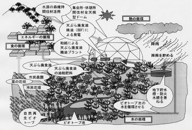 環境先進県を標榜する鳥取県と鳥取市は、3年前に全国で初めて「環境」を名称に掲げた大学「鳥取環境大学」を立ち上げ、来年卒業生を出すまでに至っている。この大学のキャンパスにも、風力発電と天ぷら廃食油の精油による発電施設を備えた間伐材ドームを設置し、それらの動力で貯留した雨水を循環させた、エネルギー自立型のビオトープづくりのモデル実験に挑戦している。造園修景で使われる滝や噴水は、化石燃料や原子力エネルギーに依存した電力を使う場合が多いが、エネルギーを自前で生み出せることが出来れば、自然再生と地球温暖化防止、そして雨水利用による水の節約という三つの地球環境問題を解決することができる。まだ、開発途上であるが、このモデルを使えば、荒廃地の緑化、市民農園による食の循環、電力や水道が断ち切られたときの防災公園、災害避難地での仮説住宅などにも使えることになる。自前の電力を搭載した間伐材ドームを、サバイバルガイアドーム(SGD)と呼んでいる。