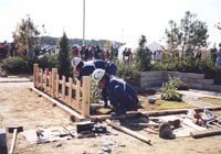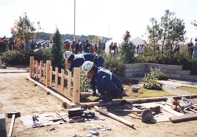 このペアは、当協会および日造連の佐賀県支部会員である㈱旭日緑化建設の前山幸輝君と、㈱古梅園の小林圭造君で、今回の課題は、3.5m×5mの区画に石積と石組、レンガ張り、園路、木柵、植栽、芝張り、草花の植え付けを行うもので、2日間にわたって、熱闘が繰り広げられました。