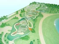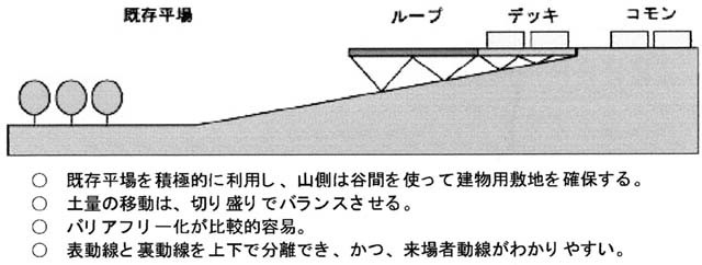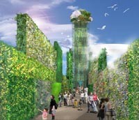 バイオ・ラングは、青少年公園地区会場「愛・地球広場」の中心に位置し、グローバルハウスの北側ファサード面に、高さ4.5m、幅150mの3層構造の自立する世界最大級の垂直緑化壁面。博覧会のテーマである「自然の叡智」を表現し、会場に魅力的なランドスケープを創出し、CO2対策や微気象を緩和する第3の社会資本としての役割が期待されている。 |