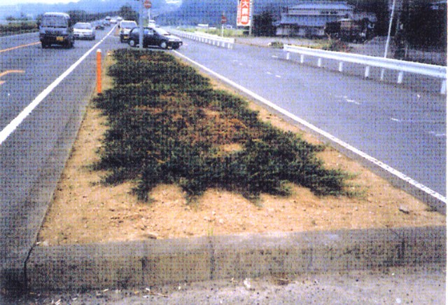 植物による手法は、地面(裸地)を被う「地被類(グランドカバー)」の利用であり、サツキ類のように下木、下草類の群植もあり、具体的に地被類に丈が何㎝以下との決まりもないため、ここでは ①丈の低いもの ②地面に密着して成長する ③刈り込みに耐える ④繁殖力が強い ⑤常緑(木本)か多年草(草本)であるものとした。 シバザクラのフィールド試験は、3月に植栽し、5、7、9、10月の年4回の除草を行い、灌水は適度な降雨があったため必要としなかった。成長は良好で、雑草は少量しか見られなかった。(写真3施工前、4施工直後、5施工後2年経過、6施工後2年経過) ハイビャクシンのフィールド試験は、植栽前に抜根除草、土壌改良後の3月に植栽、6月に抜根除草を行った。適度な降雨の後の晴天で雑草が繁茂し、ハイビャクシンを覆い、日照不足と自動車の排気ガス、暑さにより、枯死が目立ち、50%から60%の枯死率となっている。(写真1施工後、2施工後5カ月経過50%程度雑草により枯死) 枯死の原因は除草時期の遅れと植栽箇所、樹種の選定の関係が考えられる。 今後の課題として、植栽箇所において、以前は年間3回の抜根除草が行われていたが、経費縮減のため2回となっており、根茎繁殖雑草が増加していたと思われる。このため、植栽を被覆させるために最初の1、2年は年4、5回の抜根除草が必要。経費は掛かるが効果は顕著である。 このため、植物(グランドカバー)による手法においては、植栽場所、種類、㎡当たりの植栽本数、植栽後の管理計画の検討が必要で、除草回数の軽減に、防草シートを併用した方法がもっとも効果的といえる。