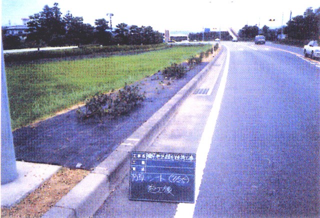 防草シートは植生的な雑草抑止として、シート下の雑草抑止、種子の飛来による雑草抑止を果たす。前者は、シートによる遮光で、盛夏の10万ルクスを99・6%以上遮光し、光合成に必要とされる400ルクス以上にならないよう遮光し、光合成を阻止、雑草の成長を抑止する。 後者は飛来した種子に水分を与えないことで発芽を防ぐ。このため、シートは透水性で、表面上に水分を保たない構造とすることで、種子はシート上で枯死する。防草シートにはこの2つの機能が求められ、さらに踏圧などの耐久性と、地面との馴染み、経済性が要求される。 利用に当たっては、①雑草の繁茂を相当期間にわたり抑制できる ②地表面をシートが覆うため、植栽本数が少なくて済む ③初期投資が必要だが除草など、以降の経費節減が見込める ④中央分離帯等の裸地部分での利用に効果が認められる ⑤交通の頻繁な道路や商店街や都心等、作業の安全や周囲への影響があり、維持管理が無視できない地域で施工価値が高い ⑥乾燥防止効果があるため、植物の生育が良好 ⑦全面施工地では雑草の発生はほとんど見られない――といった利点を持つ。(写真7防草シート施工直後、8施工後8週経過) 一方、①コストが掛かる②チガヤ、ススキ、ササ等の地下茎が残っている場合に発生 ③縁石部分などで発芽防止の工夫が必要 ④宿根系の匍匐枝による繁茂植物と低木以外の球根、一年草、地下茎等の繁茂形態植物は、次世代の更新ができず永年使用ができない ⑤タバコの投げ捨て等により、溶融し、穴が開いて雑草が発生する――点には注意が必要である。 こうした長所と短所については、改良も加えられ、ポット苗を植栽する植え穴や縁石との隙間からの雑草発生について、遮光シーリングなどで解決のめども立っている。 こうしたことから、植物とシートの併用においては、施工前に除草剤を散布して被覆すると好効果が得られ、初期コストは掛かるが、年間ベースで経費の節減につながり、軽作業員の確保を考えた場合にも作業軽減は効果があるといえる。