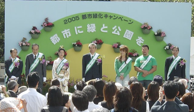 都市緑化月間の10月、その中央行事として7日、11時40分から16時まで、東京・中央区銀座の数寄屋橋公園で「都市に緑と公園を」合言葉に都市緑化キャンペーンが開かれた。 |