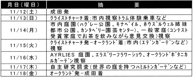 当協会は、ガーデニングやグリーンビジネスに関する技術や知識を広げ、深めるため、「エラズリー・フラワーショーとガーデニングビジネス調査」視察研修を企画。視察期間は、11月12日から18日までの7日間。ニュージランドのクライストチャーチ・オークランドを訪れる。貴重なこの機会に、お誘いあわせのうえ、ぜひご参加ください。 今回の視察研修は、大阪花の博覧会を契機にガーデニングが日常生活に定着し、大きなマーケットを形成していることから、ガーデニングショーをビジネスとして成功させている南半球最大級のエラズリー・フラワーショーをコンテスト審査員経験者の詳細な解説付きで視察。 日本でも広がりをみせているオープンガーデンの視察も組み入れ、ガーデニングやグリーンビジネスに関する質疑の時間も設定。 そのほか、40年の歴史と4・5haもの面積を持つエアーリーズガーデンや一般の植物園とは異なり、各国の特徴あるガーデンや生産のためのガーデンまで5つのテーマごとに「庭園が語りかける物語」として整備されたハミルトンガーデン(58ha)などを訪ね、ガーデニングを国の文化とし、学ぶべきものが多い同国のガーデン文化に触れる。 視察費用は34万5千円(2名1室)。問い合わせは、当協会事務局まで。 |