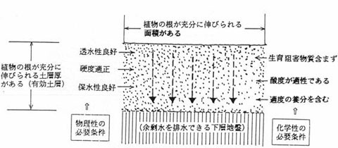 (社)日本造園建設業協会は、平成2年度から4年間にわたり建設省(現国土交通省)の土木研究所と″植栽基盤の造成技術に関する共同研究″を行った。この時はじめて植栽基盤とは「植物が正常に生育できるような状態になっている地盤」だけを示す用語であると定義し、「植物の根が支障なく伸長して、水分や養分を吸収することのできる条件を備えており、ある程度以上の広がりがあり、植物を植栽するという目的に供せられる土層を植栽基盤という。なお、排水層がある時はこれを含む。」と定義された。 |