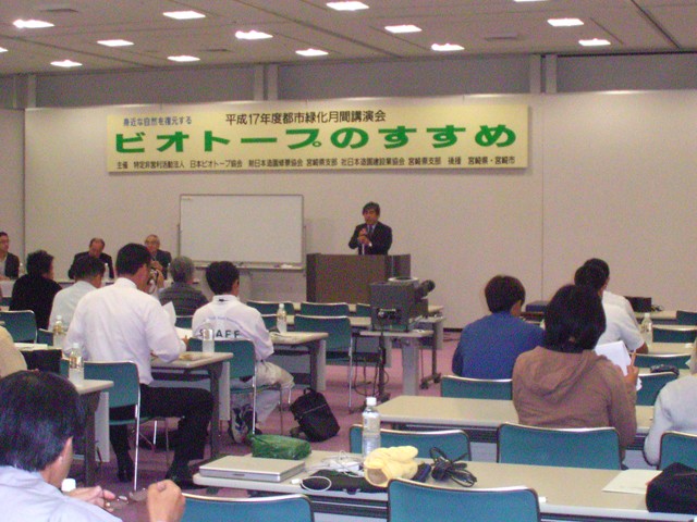 宮崎県支部では、10月18日にNPO法人日本ビオトープ協会・7日本造園修景協会宮崎県支部との共催による緑化月間講演会を開催、県内の行政機関・教育関係者を始め日造協会員等約100名が参加した。テーマはビオトープ。 当日は、午後1時30分より ①現在日本のビオトープの第一人者である杉山恵一氏(富士常葉大学教授)による「ビオトープ現在の動き」を初めとして ②学会から南九州大学関係者による「学校ビオトープ」③施工面から梶岡幹生氏(NPO法人日本ビオトープ協会主席ビオトープアドバイザー・カジオカL・A代表取締役 ― 日造協広島県支部会員)による「ビオトープの施工事例・利活用」の3テーマでの開催であった。 当日の参加者は、杉山教授によりビオトープの概念を理解し、南九州大学関係者より国内並びに世界の学校ビオトープの現状を紹介され、最後に梶岡氏より国内の施工例並びに提案の方法の具体的アドバイスを頂くことが出来た。今後のビオトープの活用に大きく資するものであったと思われる。 宮崎県支部では、緑化月間にちなみ、昨年は県木であるフェニックスの危機に対して、その現状・今後の対応計画等を報告する講演会を開催した。本年度は、本部方針にもある通り、新分野への業務開拓 ― 今世紀に拡大する環境産業における、環境創造及び環境修復――を担うためにに、本講習会を開催し、ビオトープへの理解を深めた。来年以降も時事の課題に対し積極的な取り組みを続けてゆきたい。 (宮崎県支部 事務局) |