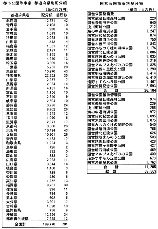 配分額は2271億円で、直轄(国営公園)に373億円、補助1898億円で、本省分865億円、一括分1406億となった。