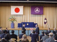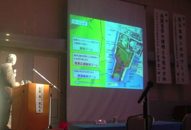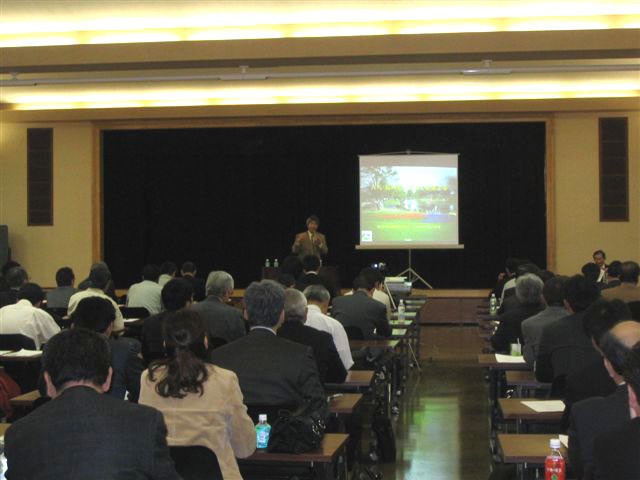 初めに、成家会長があいさつ、次いで、高梨雅明 国土交通省 審議官からごあいさつをいただいた。 成家会長は、「長引く景気低迷のため、造園工事の完成高も年々減額してきており、当協会会員の退会等を含め会費収入が大幅な減になっている。このため現在、特別委員会を設け財政・運営など当協会の基本的な問題について検討中である。また、これと並行して21世紀の造園業をめざしたビジョンも策定中である」と日頃のご指導のお礼を含めてあいさつを述べた。
