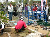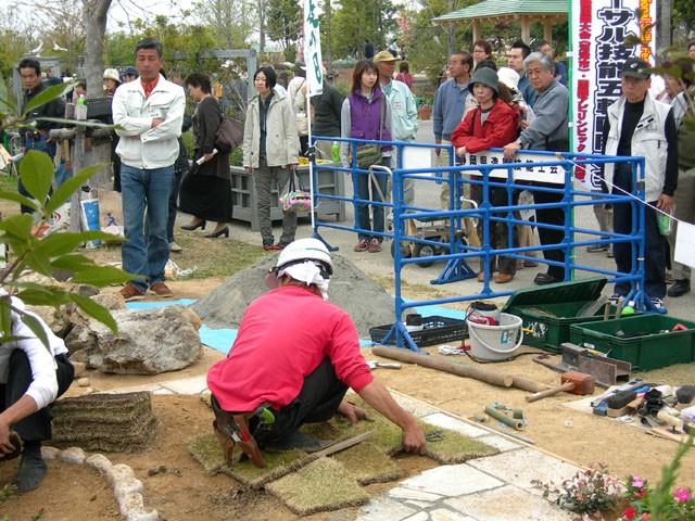 さて、浜名湖花博の跡地、浜名湖ガーデンパークでは4月28日から30日の3日間浜名湖フラワーフェスタが開催され、予定の5万人を大幅に上回る延べ5万8千人の来場者で会場は大変な混雑でした。静岡県支部も主催者の一員として静岡県造園緑化協会と共に参加しました。その中で注目は、技能五輪静岡県代表候補者3チーム6人による庭園制作の実演でありました。若手造園家による庭作りパフォーマンスには、多くの来場者が足を止め見入っておりました。出来上がった作品を鑑賞するだけでなく実際に造園家の卵達のきびきびした動きそのものが絵になる、即ち作業そのものが作品だと感じたのではないでしょうか。