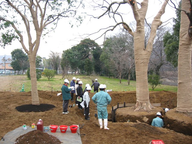 支障木は、①巨樹・老齢木のため活着が悪く、移植が困難と思われた樹木②既存樹木を保全するか、更新するかで長きに亘り行政側と市民・有識者との間で論議が重ねられた樹木です。いずれも幹周3m以上の大径木も多数含まれており、移植の可能性をさぐる目的で樹勢・根系・土壌・腐朽(空洞)等の調査を行いました。