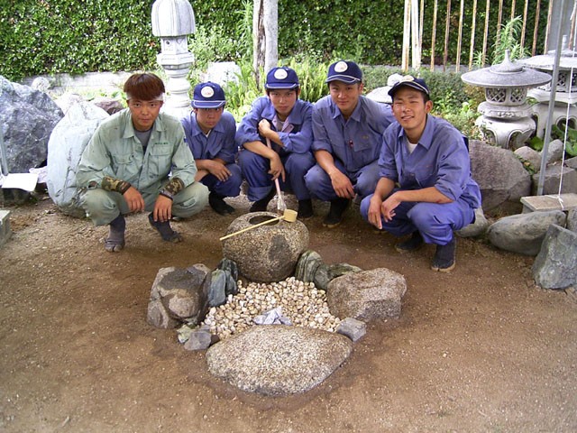 開会にあたり高須賀青年部会長、井門講師から蹲踞の由来や、用途・作業方法についての説明を行いました。作業は4人1班で、協会員である造園技能士の講師1名の指導のもと、作業を開始。全員が石選びからはじめ、水鉢、前石、役石、飛び石等を試行錯誤しながら据付けていきました。