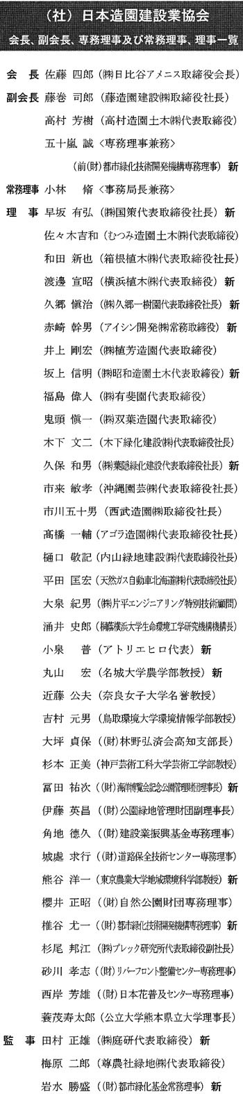 しかし、最後に将来を見据えた造園業界、個々の会員企業の行動指針となる日造協のビジョンも改定し、私たち造園建設業を、オープンスペースをマネージメントし、計画・設計、施工、管理する緑のスペシャリスト、緑地管理のゼネラリストとして、人と緑が共生する「緑の景観・環境」創造事業を目指すこととすることができました。