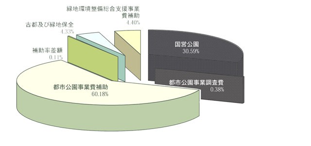 都市公園等事業では、用地3分の1、施設2分の1の割合で補助が行われている。近年、地方公共団体の財政悪化によって補助事業のウェートが高くなっている。