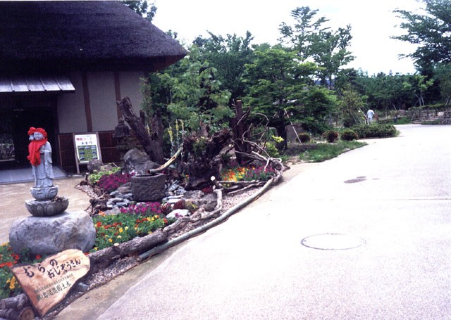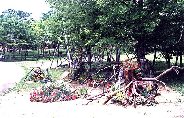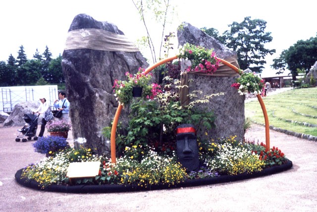 今年の「花普請 in みちのく」は、巨石をいける ― 巨石ガーデニング、民家をいける ― 花普請、道端をいける ― 道普請をテーマにし、「巨石をいける」は、東北地方に栄えた縄文文化を象徴する渦巻き模様の中心にアンモナイトの化石が、東西南北に巨石が立つ、時のひろばの巨石装飾を日造協宮城県支部から11点、「民家をいける」は、東北の各県を代表する古い民家を移築、復元し、ふるさとの風景を創り出したふるさと村の古民家の庭先に、日造協宮城県支部から5点、「道端をいける」は、ふるさと村へ通じる途中のお祭り広場周辺に、宮城県柴田農林高校ほかから3点と合わせて19点、造園家、学生たちによる技で、時のひろばからふるさと村まで花普請し、いつもと違った心の癒せる空間を創出し、ポピーまつりに華を添えた。