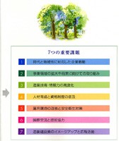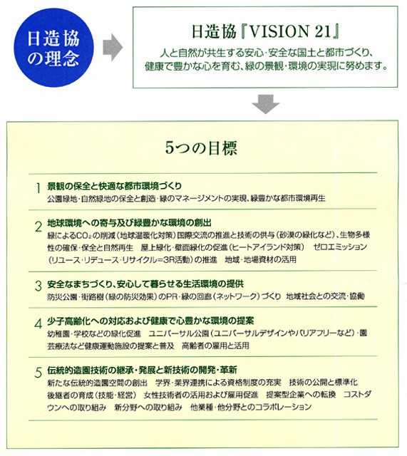 このうち、ビジョン21については、造園建設業界および個々の会員企業の行動指針となること、また、経営体質の強化、技術の向上と人材育成、造園建設業界の新しいイメージづくりなどを目標に「5つの目標、7つの重要課題」(詳しくは本誌3面参照)について説明し、「人と自然が共生する安心・安全な国土と都市づくり、健康で豊かな心を育む、緑の景観・環境を実現」するため、発注機関はもとより学校、市民等にも幅広くPRしていく。