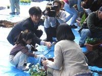 特に、花苗の植え付けは、十数種類が用意された花苗を、参加者が自由に選んでプランターに植え付けるもので、担当者の案内を聞きながら、思い思いの花苗、最後に自身のニックネームなどを書き込んだ名札をつけて完成。また、出来上がったプランターは作者と一緒に、日造協の活動や公園のできるまでを解説したイベントの開催案内パネル前で記念撮影され、その場でプリント。当日の参加記念として好評となっただけでなく、プランターはその後も管理事務所に飾られ、ちょくちょく様子を見に来たいと公園のリピーターを増やす格好のイベントともなった。