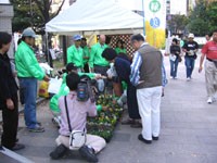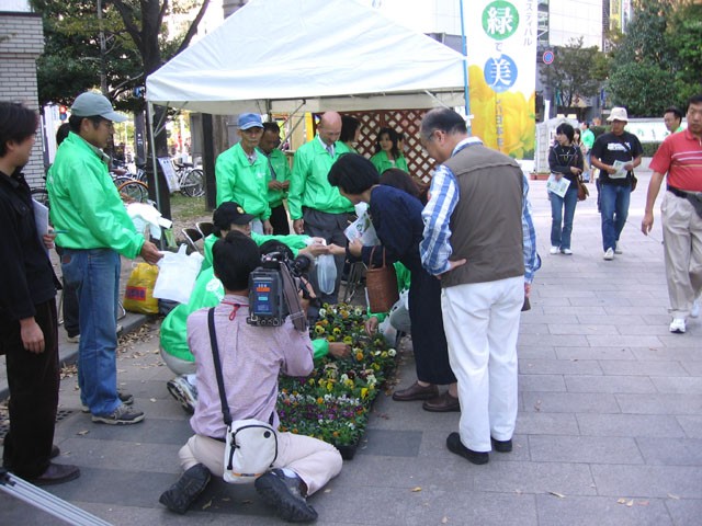 当日、天神中央公園ではマスコミの取材も行われ、花と緑”美しい町並み“をという題目で、 夕方のNHKニュースで映し出されました。ニュースでは「花と緑で美しい日本を!」と書かれたお揃いのジャンパーを着た20数名の県支部会員が、色とりどりのパンジーやビオラを多くの市民にプレゼントしている公園での奮闘ぶりが映し出され、また会場での和やかな雰囲気や木下九州総支部長のインタビューのなかで「家庭でも花を飾ってもらい美しい町並みをつくってほしい」という言葉が紹介されました。
