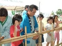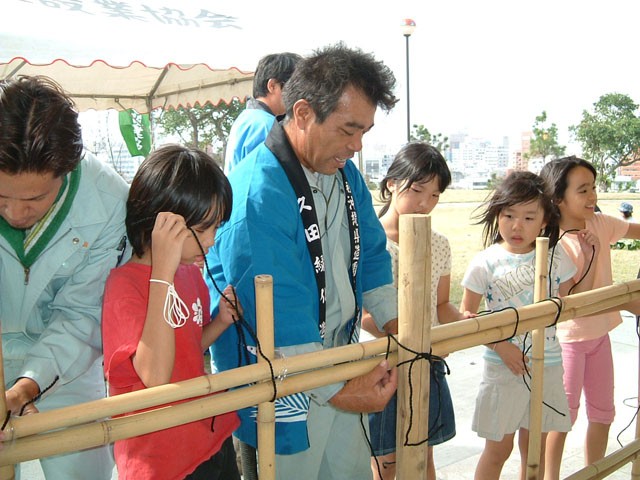 続いてパネル展示により造園業の仕事や都市における緑の大切さを参加者へアピールし、理解を得ました。ひき続き行われた「ロープ結び教室」は、交差させた竹垣をしっかりと固定するロープの結び方を会員らが教えるというもので、多くの児童が実際に体験して指導を受けました。「難しい」と苦労する児童もいましたが、教えてくれる会員の手元を熱心に見つめ、プロの技術を学びました。