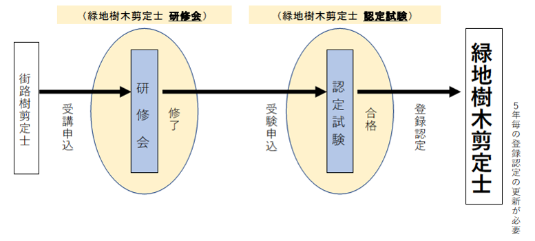 こうした現状を踏まえ、街路樹剪定士の持つ知識と技術に加え、公園や緑地の樹木に関する基礎的な知識を有し、樹木の剪定整姿などの適切な育成管理や日常の安全点検を行うことのできる技術者を養成するため、すでに街路樹を対象に剪定・管理を行っている「街路樹剪定士」をベースに、新たに「緑地樹木剪定士」資格制度を創設することとした。